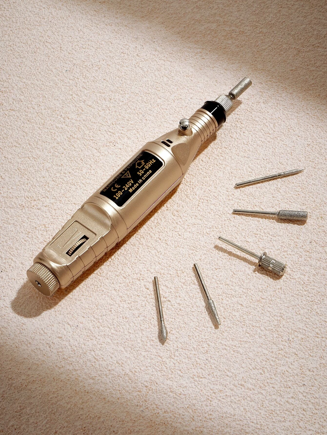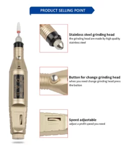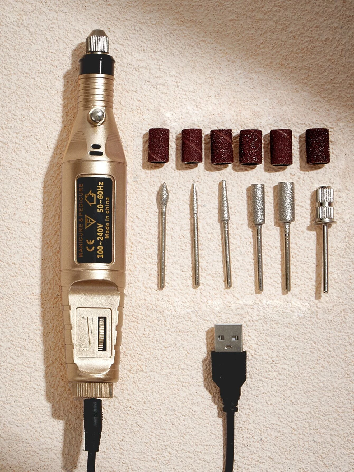 Portable electric nail drill with 6 replacement drill heads and USB charging cord.