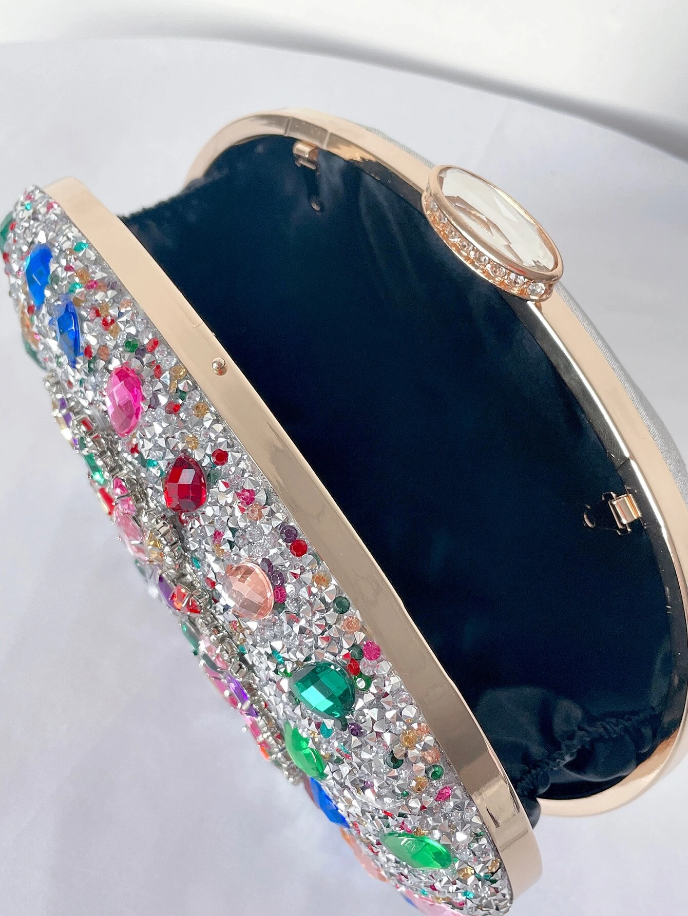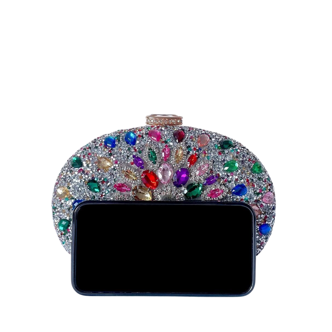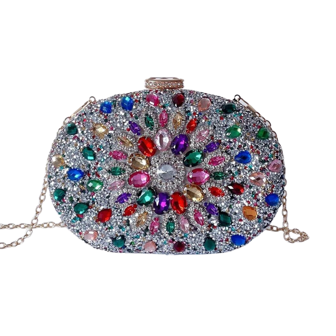 Rainbow silver gemstone handbag. Bag height is 12cm. Bag length is 20cm.