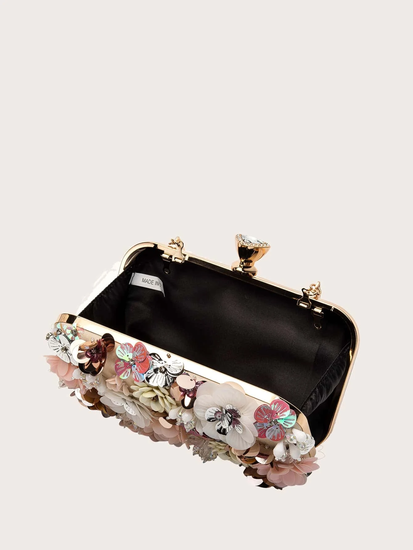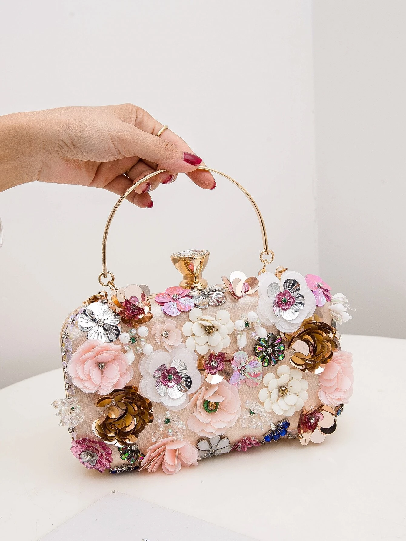 Pink floral handbag. Bag height is 11cm. Bag length is 20cm.